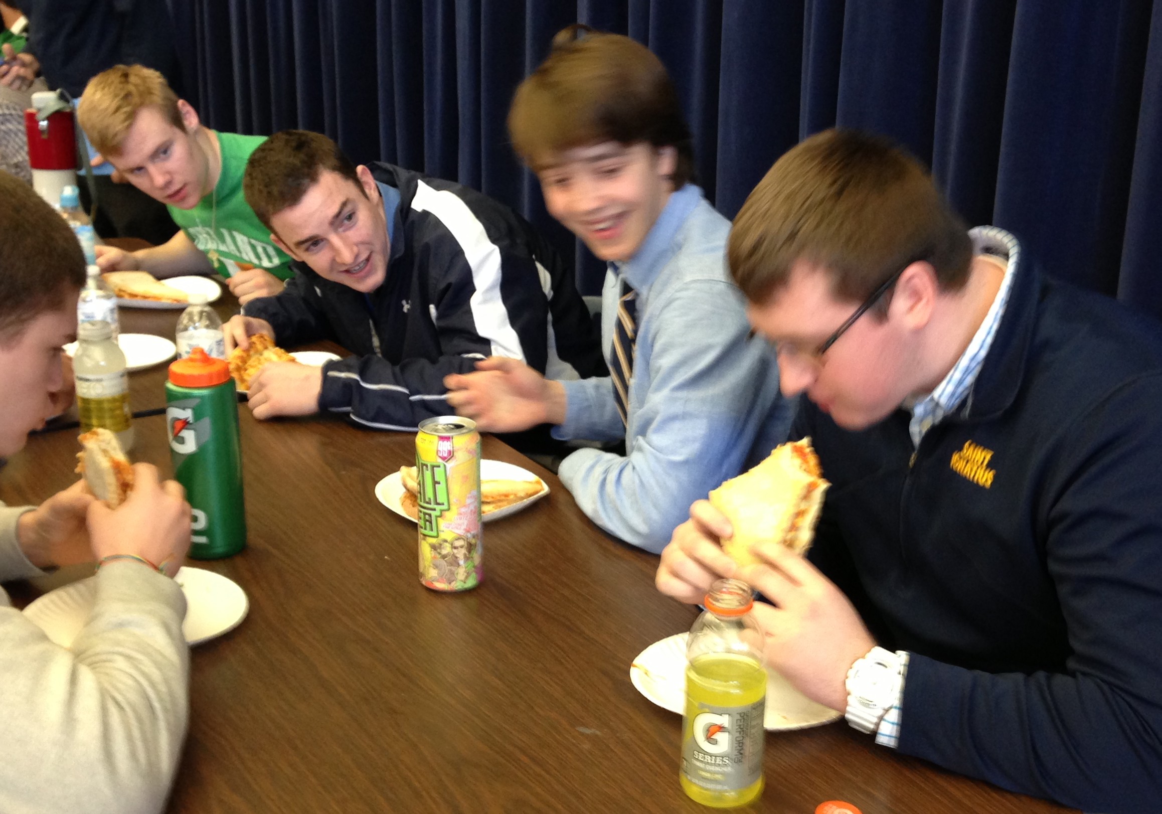 The pie eating contest featured teams of four students each given two pieces of pizza to devour in as little time as possible. However, only one of the students was allowed to eat at a time. After the first student finished, the second could begin. Time for an individual’s consumption of the pizza ranged from one minute all the way to five and established some students as strong stomached and others as picky eaters. The winners of the fourth period event, Michael Cera ’15, Cameron Tolbert ’15, Ewan Johnson ’16, and Michael Penn ’15, all recounted the contest saying, “It’s not as easy as it looks. It takes a strong stomach and an iron will.”